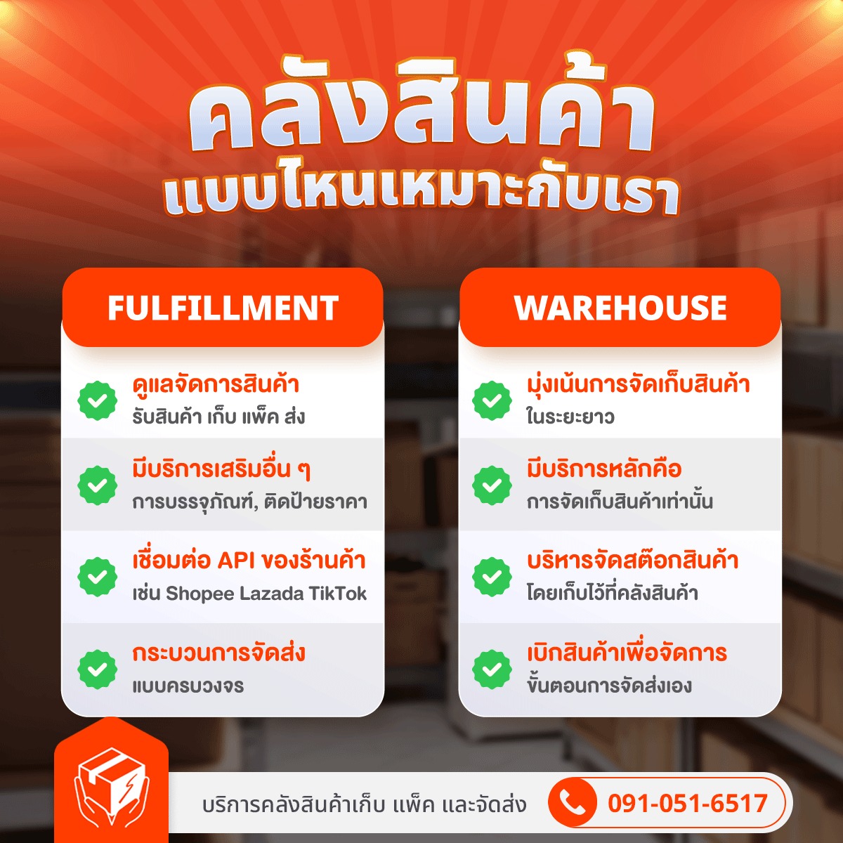 Fulfillment จะดูแลจัดการสินค้าตั้งแต่รับสินค้า จัดเก็บ จัดส่ง จนถึงการติดตามสถานะการจัดส่ง ขณะที่ Warehouse มุ่งเน้นการจัดเก็บสินค้าเป็นหลัก โดยร้านค้าจะต้องจัดการกระบวนการจัดส่งเอง นอกจากนี้ Fulfillment มีบริการเสริมอื่น ๆ มากกว่า และสามารถจัดส่งสินค้าได้รวดเร็วกว่า